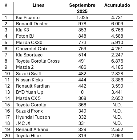 Adicionalmente, ha sido el mes de mayor ventas en el año. En el acumulado de ventas de 2025, ya entraron a circular por las calles del país 175.025 vehículos nuevos. A partir de las cifras de Andi-Fenalco, en carritos.co presentamos el top 20 de lo más vendido en el país.